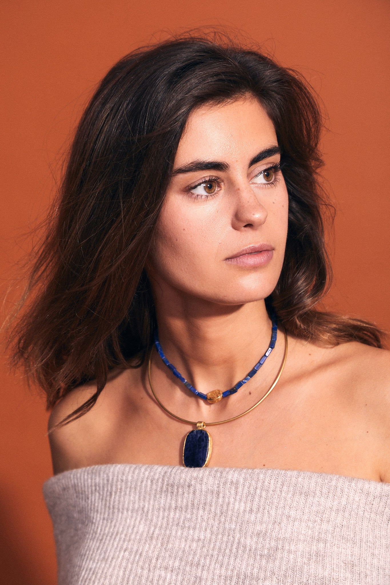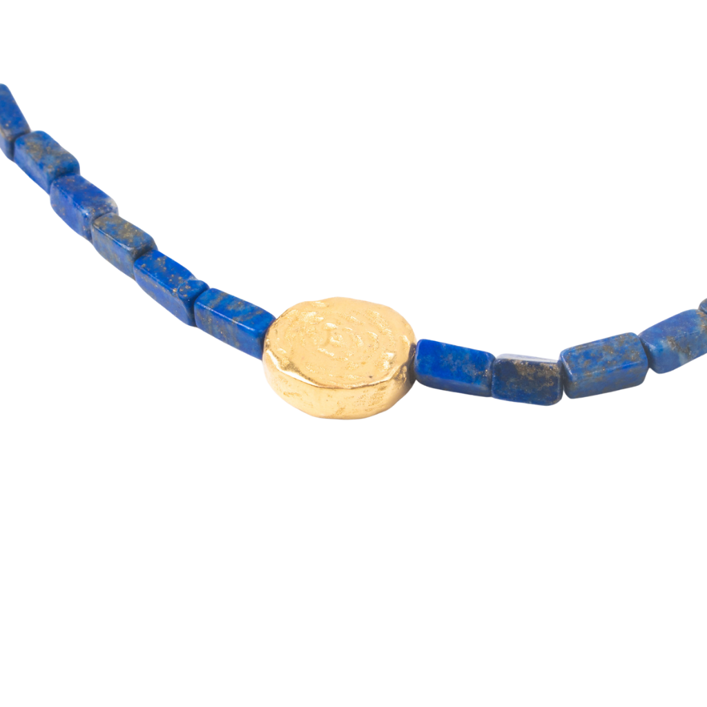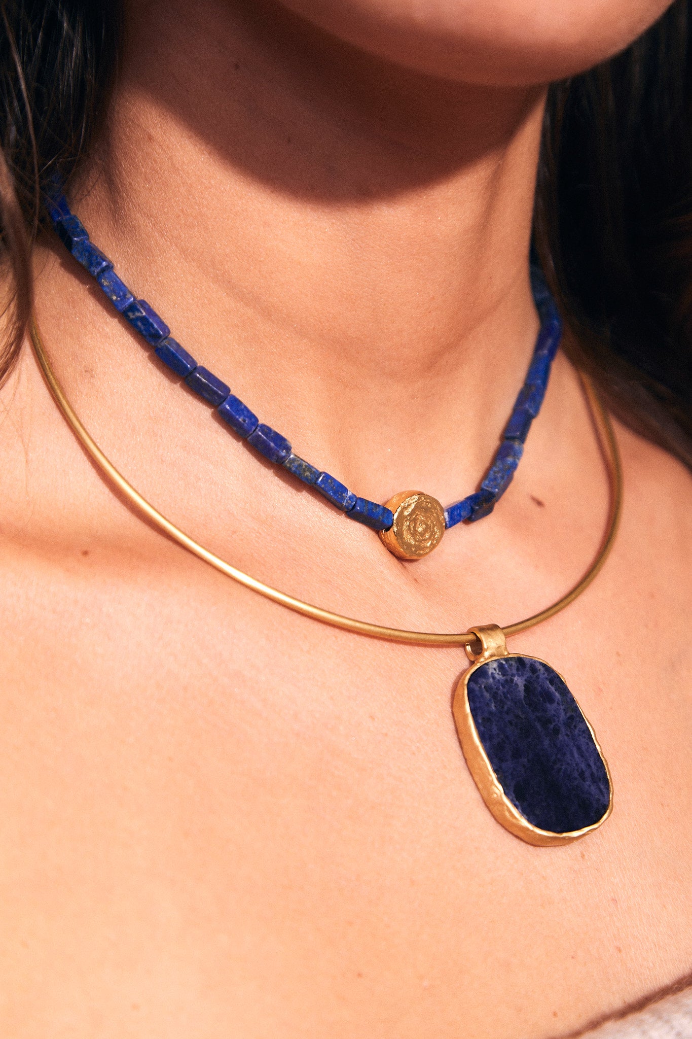 The Lapis necklace combines lapis lazuli beads with a handmade pendant.