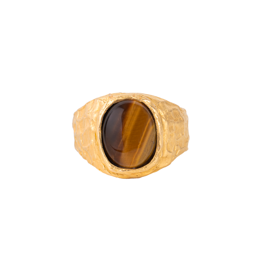 Handmade signet ring with a textured finish and natural tiger’s eye stone.