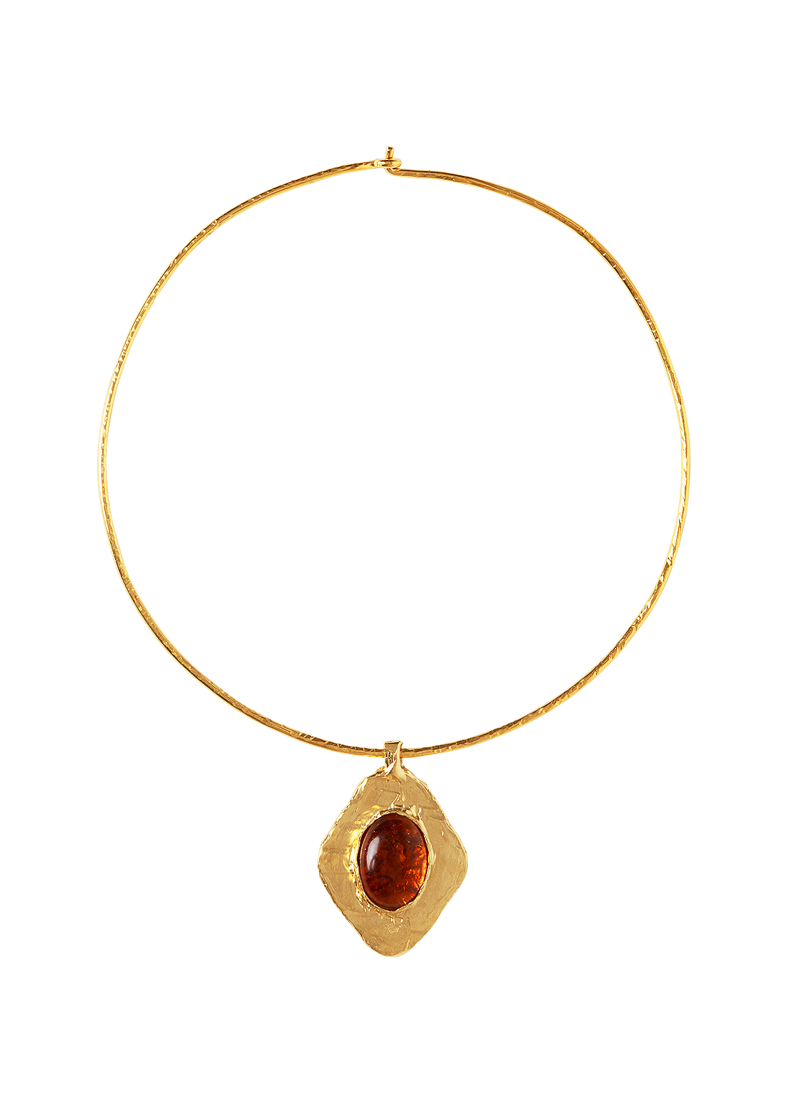 Choker artesanal con piedra natural de ámbar engastada en un colgante en forma de rombo. Su acabado texturizado realza su diseño, mientras que los cálidos tonos del ambar aportan profundidad y carácter.