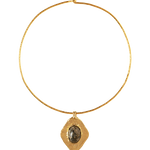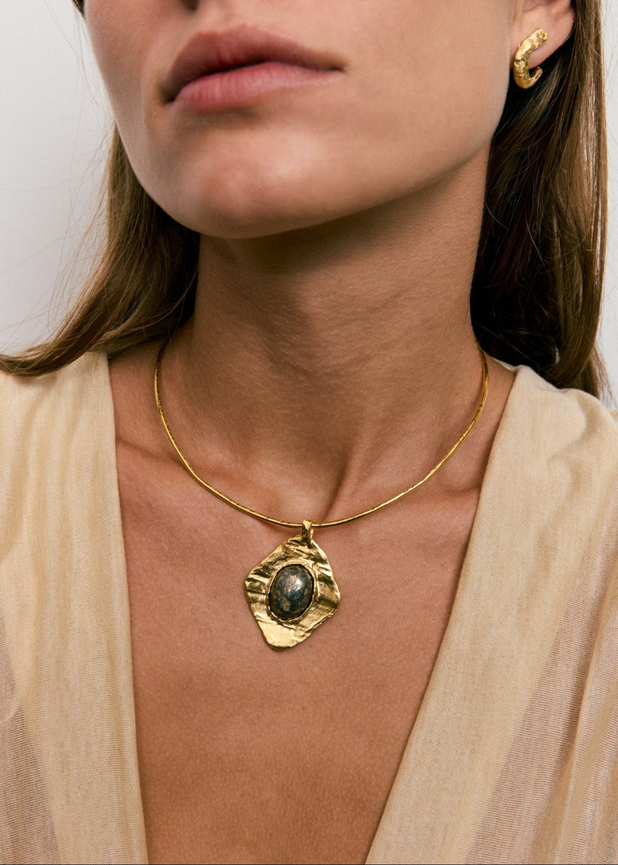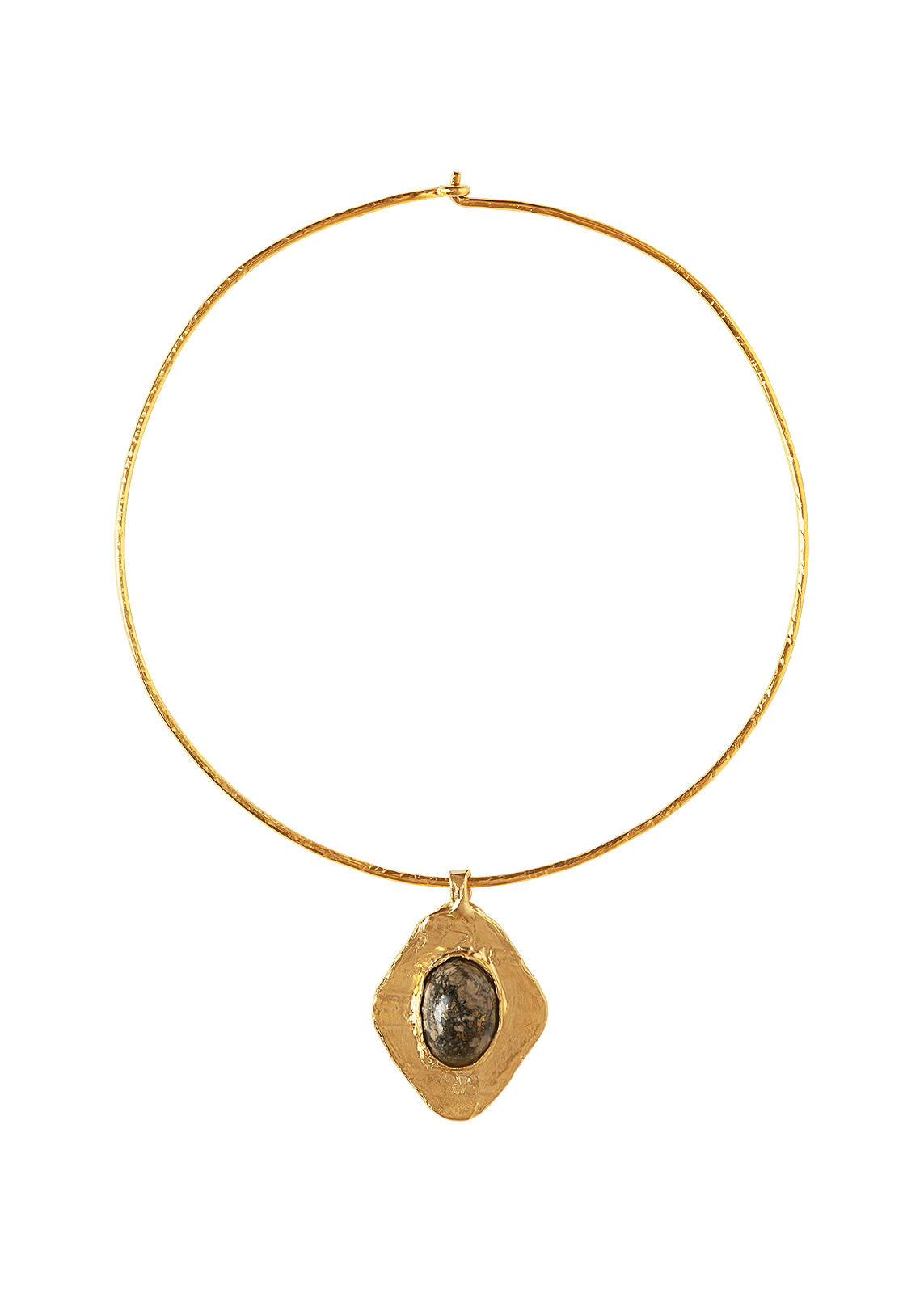 Collar artesanal con piedra natural de pirita engastada en un colgante en forma de rombo. Su acabado texturizado realza su diseño, mientras que los tonos naturales de la pirita aportan profundidad y un brillo sutil.