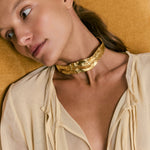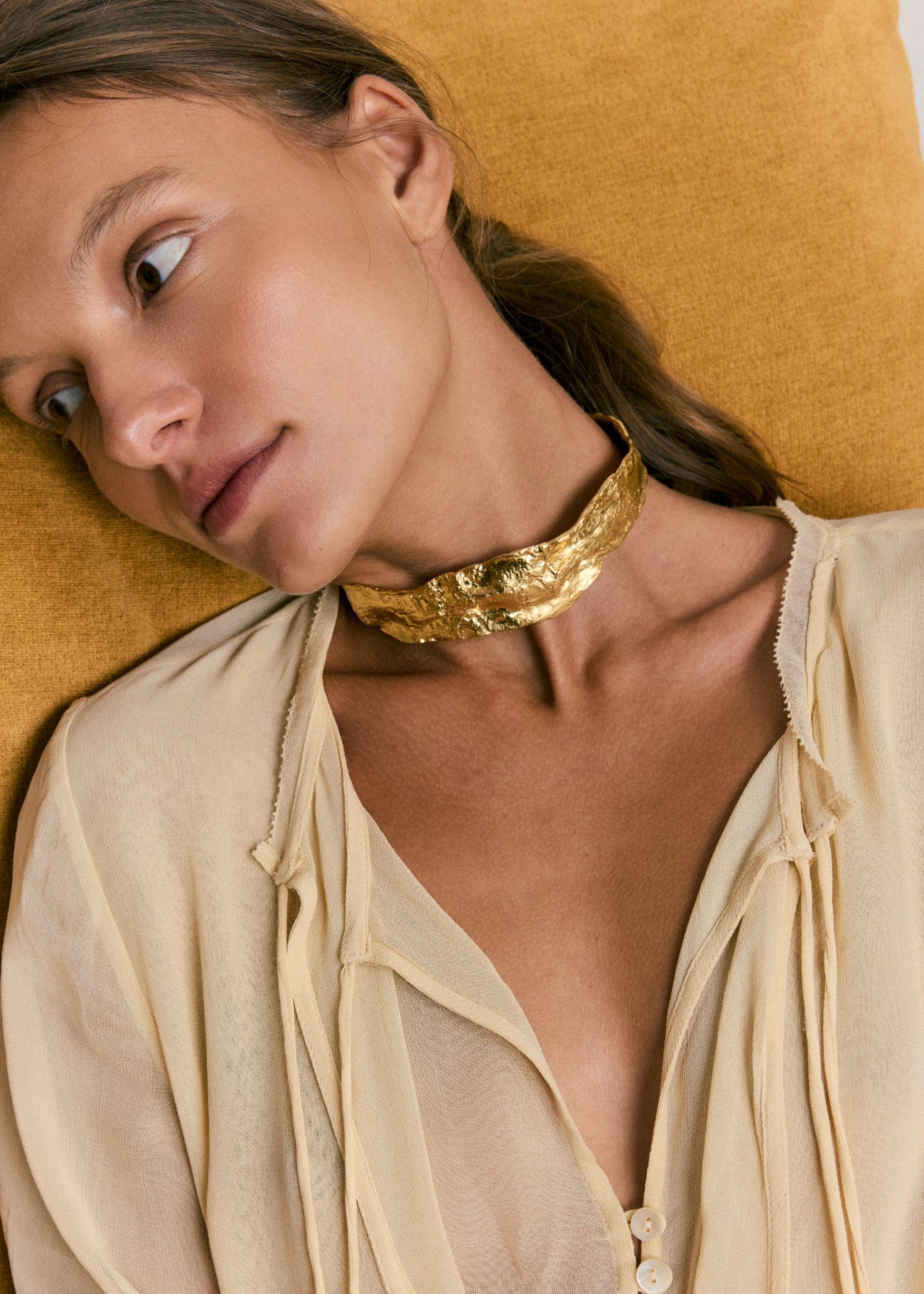 Choker artesanal que destaca por sus formas escultóricas y texturas únicas. Su diseño maleable permite ajustarlo a la medida deseada. Esta pieza atemporal combina artesanía y elegancia.