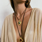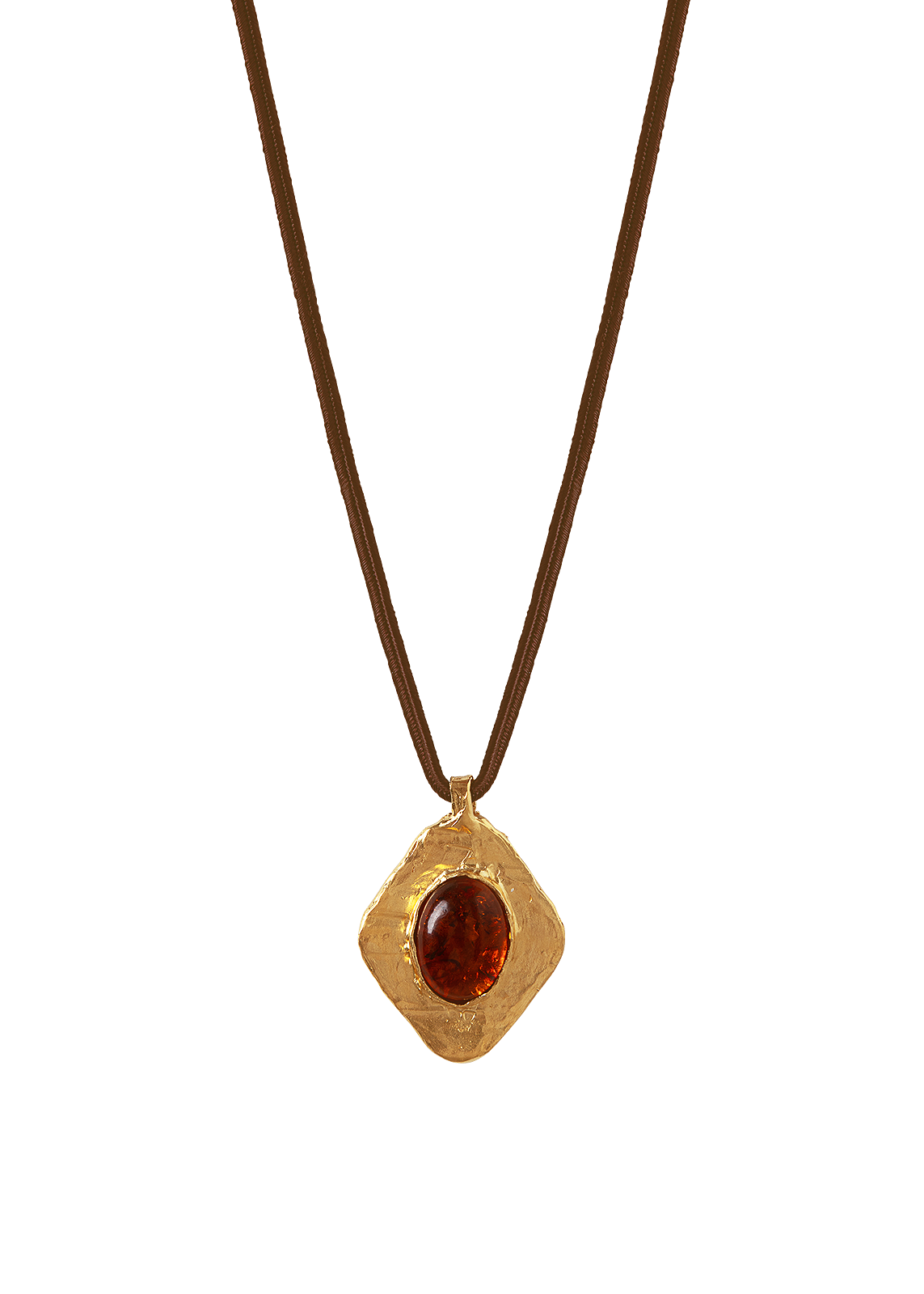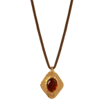Collar artesanal con piedra natural de ámbar engastada en un colgante en forma de rombo. Su acabado texturizado realza su diseño, mientras que los cálidos tonos de la pirita aportan profundidad y carácter.