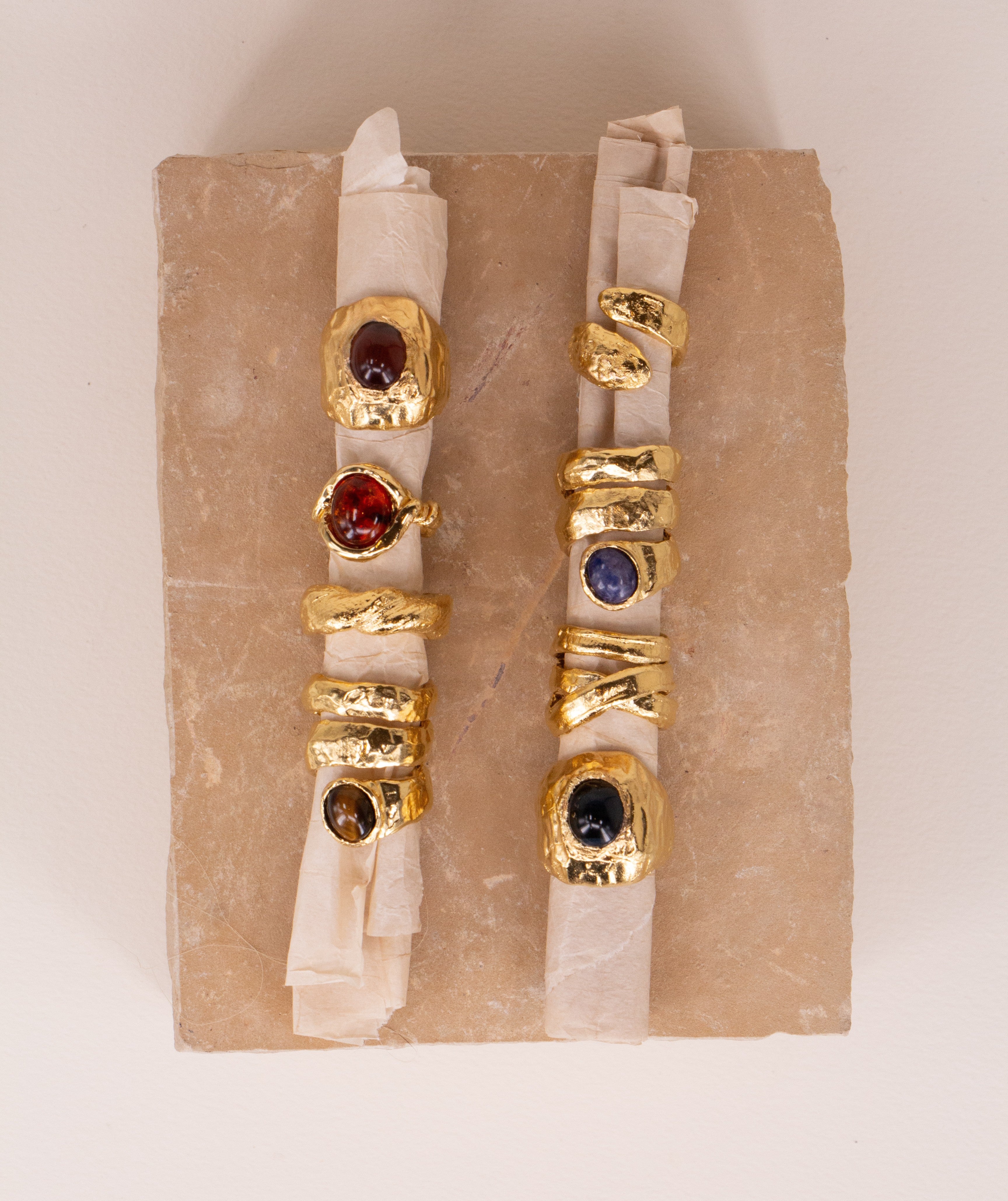 Each piece of jewelry starts as wax, hand-sculpted by Júlia. She lets the process guide her as she shapes small sculptures, exploring textures and volumes.
